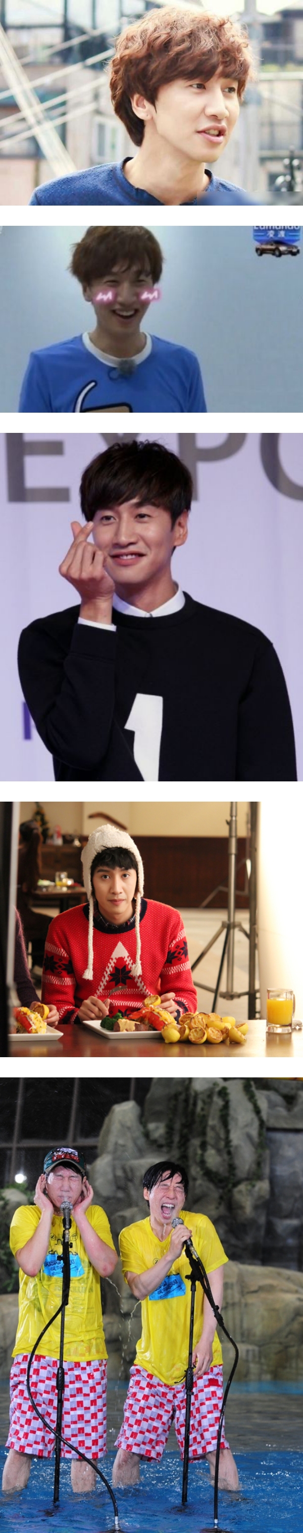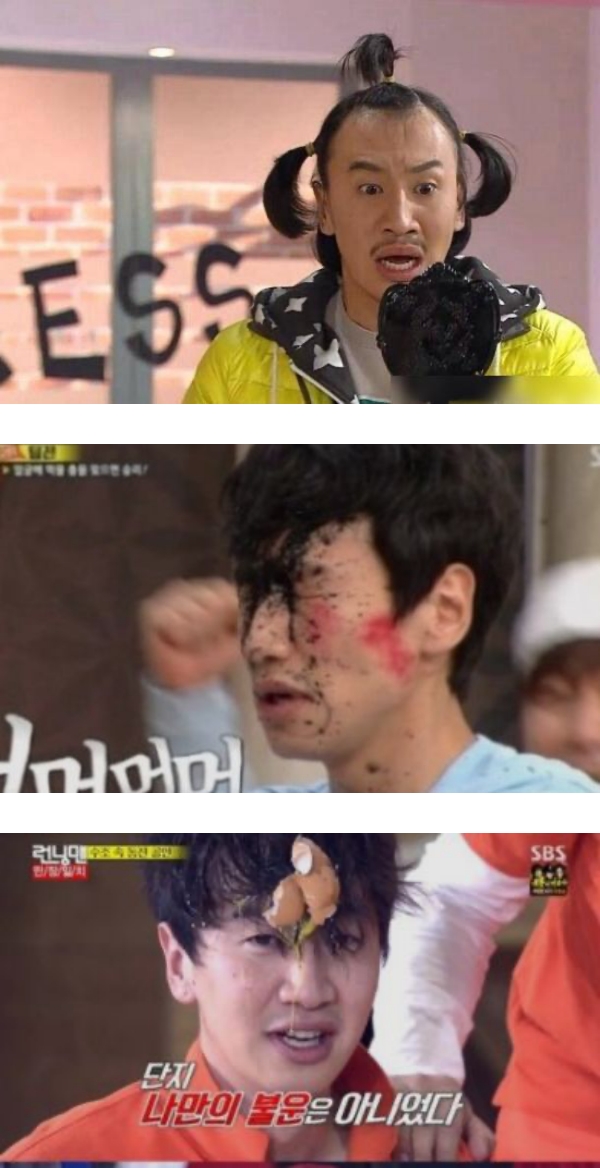李光洙的运气在节目中可是出了名的“好”,跟宋智孝的好运气是完全相反的,运气常常背到了极点。他在节目中每次都被整的满身肮脏,倒霉的瞬间让观众直呼节目组故意整他。