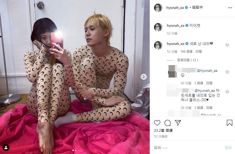 泫雅14日在社交平台分享了和男友的合照,写道:“新买的保暖卫生衣,好温暖”。只见两人穿着肤色长袖紧身上衣与同样花纹的紧身长裤,虽然有网友称赞两人的大胆,但也有人忍不住留言:“时尚好难懂。”