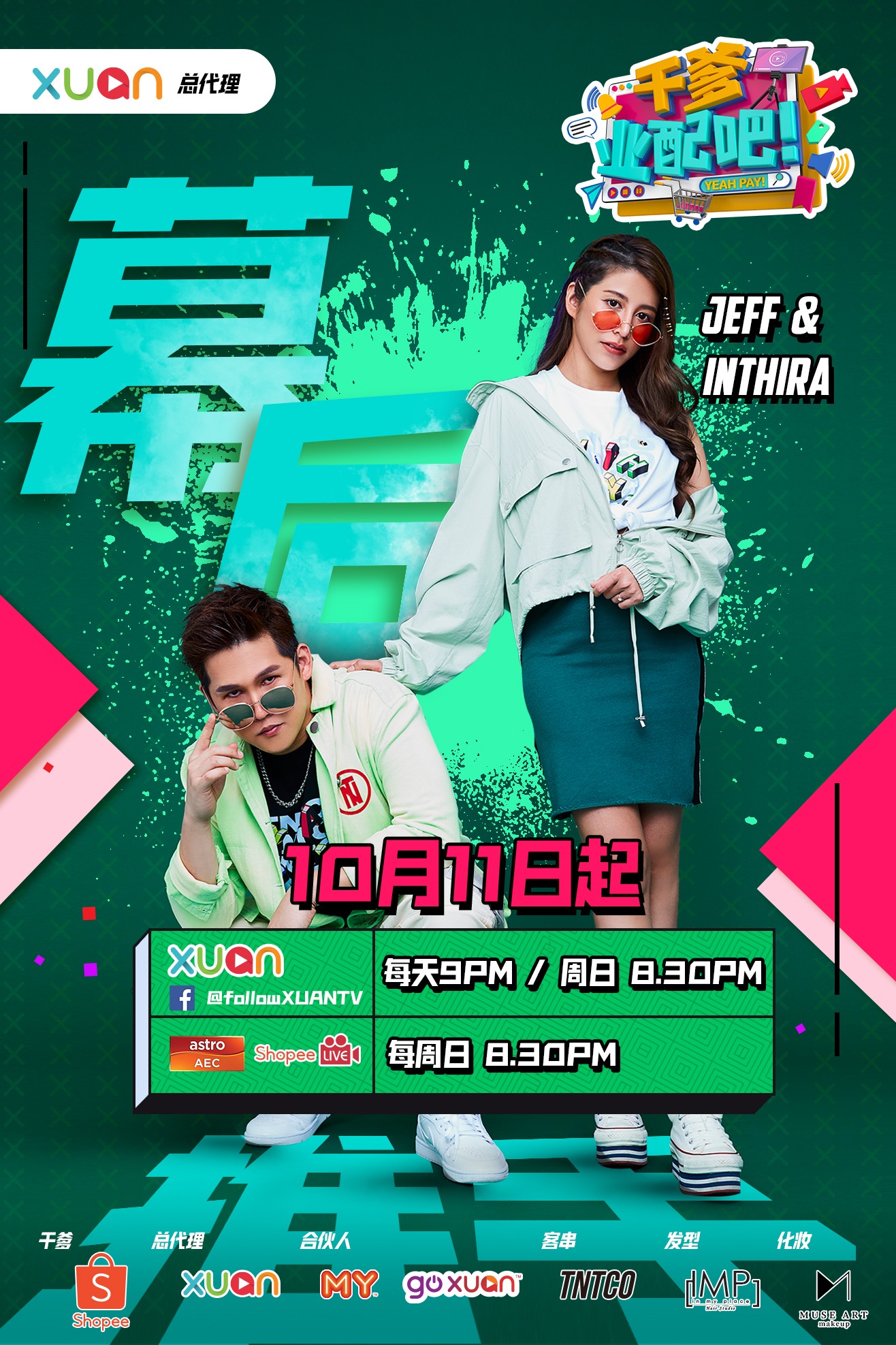 《干爹业配吧!》10月11日起,每天晚上9点、周日晚上8点30分,XUAN TV Facebook 播出;Astro AEC、Shopee LIVE 每周日晚上8点30分播出。
