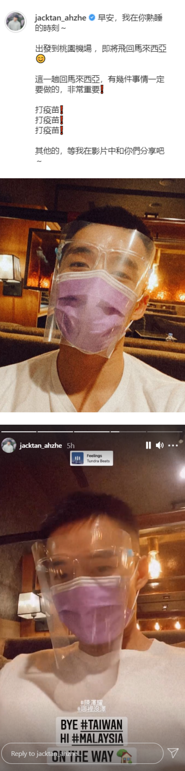 阿哲戴着口罩、护目镜以及面罩前往机场,透露这趟回马来西亚有几件非常重要的事情一定要做,其中一项就是打疫苗:“其他的,等我在影片中和你们分享吧~”他也在IG Story分享出发前的照片,“BYE #TAIWAN,HI #MALAYSIA”。