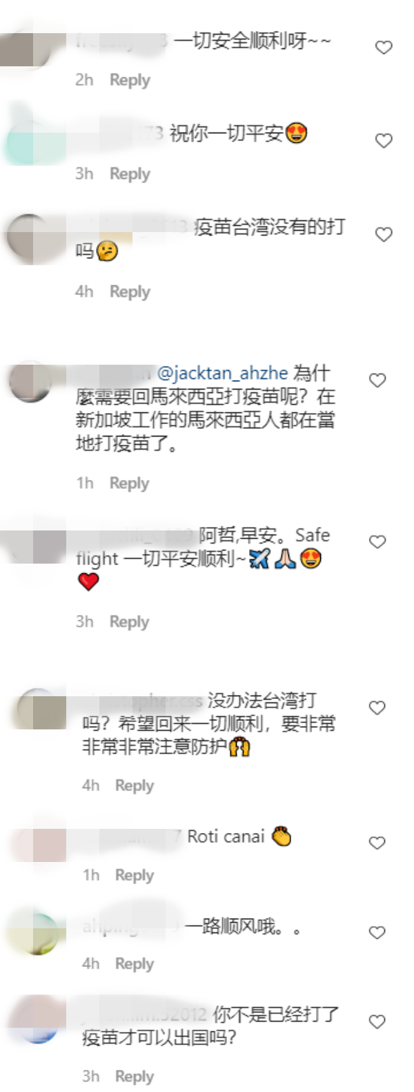 阿哲在去年飞往台湾工作,加上受疫情影响,他已经在台湾逗留逾半年。如今回马接种疫苗,让许多网友惊喜的当儿也十分好奇:“疫苗台湾没有的打(疫苗)吗”、“为什么需要回马来西亚打疫苗呢?”、“没办法台湾打吗?希望回来一切顺利,要非常非常非常注意防护”、“你不是已经打了疫苗才可以出国吗?”