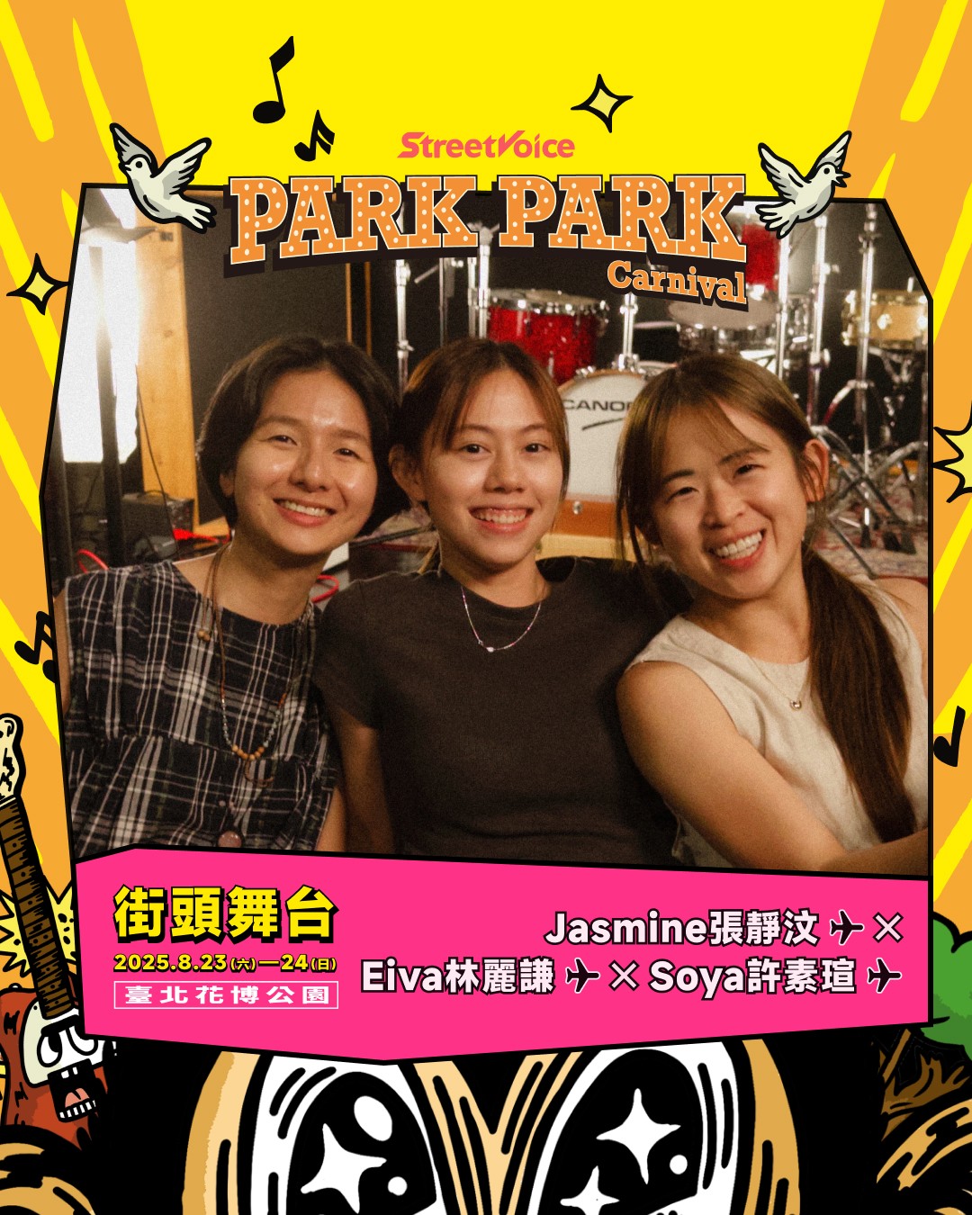 除此之外,Jasmine 张静汶、Soya 许素瑄、Eiva 林丽谦,将远赴台北参演《Park Park Carnival 叭叭嘉年华》。她们将一连两天在台北圆山华博公园的 “猿人舞台” 及 “傲蕉舞台” 上演出,除了会独唱个人原创作品外,也会以 “限定女团” 的组合形式合唱,展现属于年轻世代的热情与活力,满满的Girls Power!