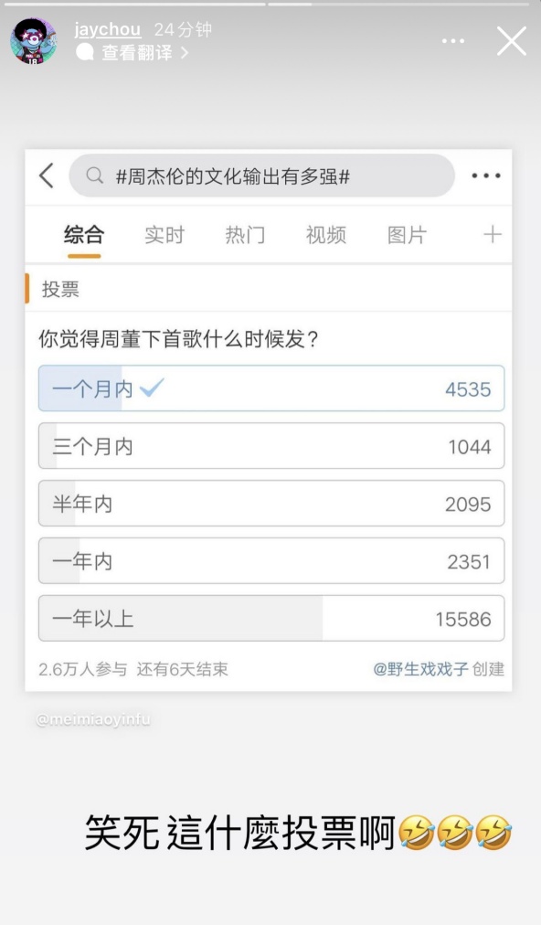 周杰伦粉丝创建“你觉得周董新歌什么时候发”话题并被正主本人发现,还吐槽:“笑死这什么投票啊”。图中可见大部分粉丝都投“一年以上”,被调侃:“笑死 根本不抱希望了”、“没有never这个选项吗”、“鸽中之哥”。