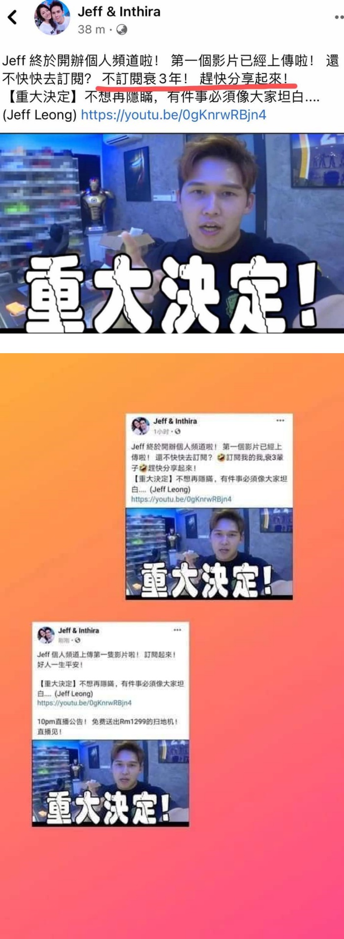 大马著名夫妻档YouTuber Jeff&Inthira的Jeff近日开设个人频道,没想到在宣传时一句“不订阅衰3年”的玩笑话,引来网友炮轰!