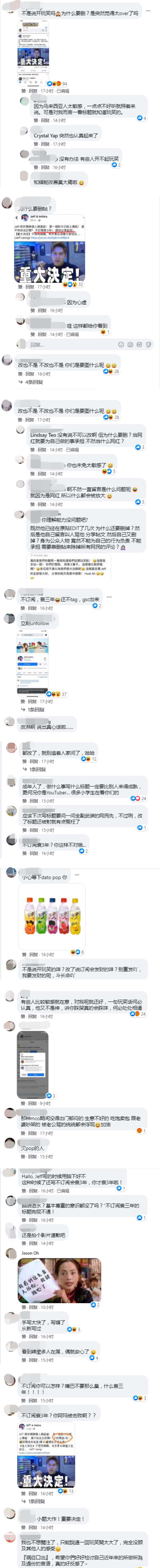 虽然Jeff已修改贴文,但还是有网友不依不饶,留言抨击:“立刻unfollow”、“这种时候了还写不订阅会衰3年,你才衰3年啦”、“成年人了,做什么事写什么标题一定要比别人来得成熟,更何况你是YouTuber...很多小学生在看你们的”、“基本尊重的意识都没了吗?”