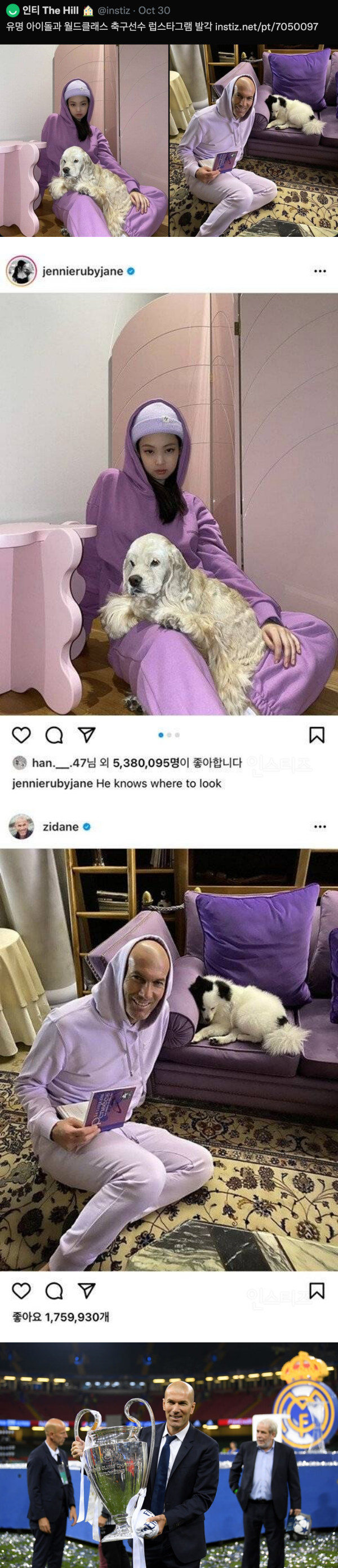 近日有网民翻出Jennie去年拍摄的一张旧照,并以“Jennie lovestagram恋爱嫌疑”为题发文,照片中可见Jennie身穿紫色卫衣、紫色运动裤和紫色冷帽亮相,而一只小狗正躺在她的腿上。49岁的法国足球名宿Zidane 则穿着同样的紫色卫衣和紫色运动裤,最巧合的是照片中也有一只小狗,让网友们纷纷觉得巧合到难以置信:“也太巧了”、“笑死我了”、“哈哈哈哈哈以为是真的”、“神奇情侣装”、“还以为Jennie跟Zidane谈恋爱呢” 等。