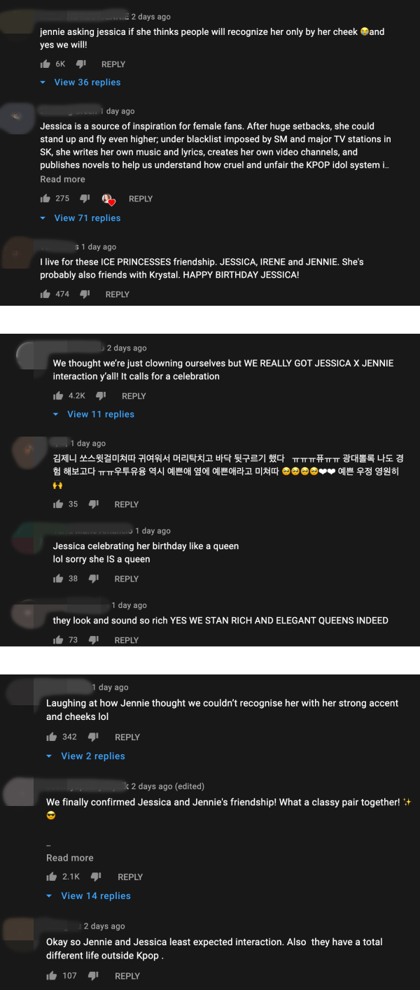 Jennie 虽然在视频中没有露出正面,但粉丝们还是凭着声音、头发、脸颊肉就认出了她,并直呼:“两人竟然认识!”、“Jennie竟然以为她的脸颊肉不会被粉丝认出来 ”、“喜欢公主们的友谊”、“Jessica和Jennie真的是梦幻联动啊”、“她们看起来很有钱,像是女王一样”、“两人有很多相同的地方” 等。