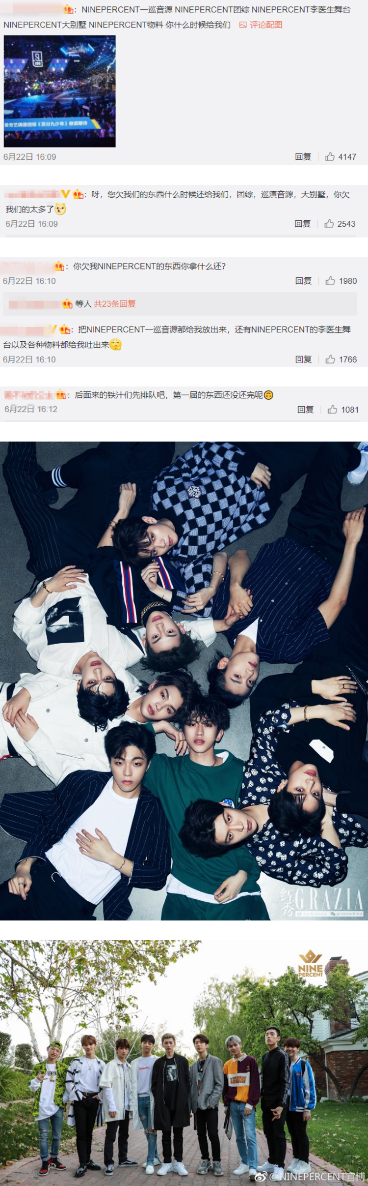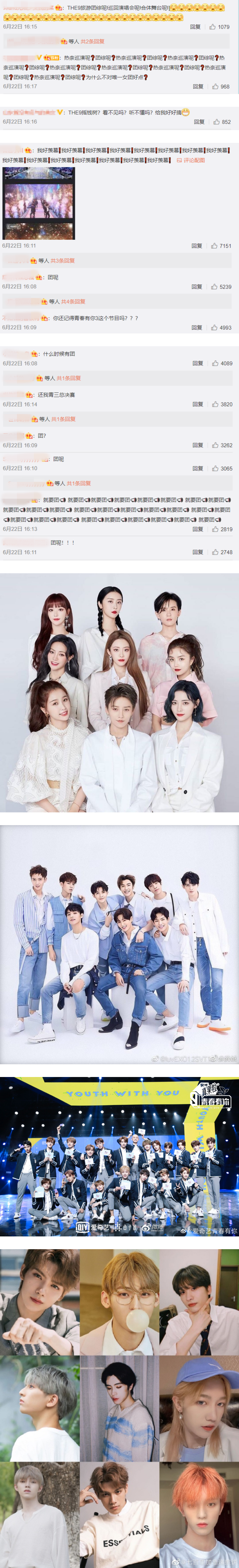 UNINE、THE9的粉丝也同样留言,要求团综、巡回演唱会等,不过最惨的还是要属清丝,在各家粉丝都在追讨资源时,他们最大的诉求却是总决赛、成团夜,热评前排几乎都被清丝占领,质问:“团呢”、“你还记得青春有你3这个节目吗”、“什么时候有团”、“还我青三总决赛”、“我们的团什么时候给我们?”