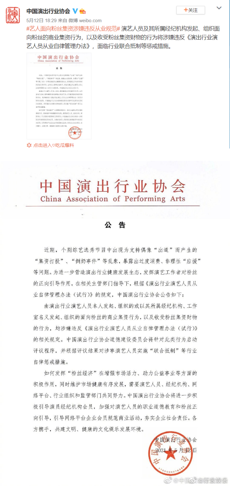 根据“中国行业演出协会”12日发布的最新公告,“严格禁止由演出行业演艺人员本人发起、组织的或以其所属经纪机构、工作室名义发起、组织的面向粉丝的商业集资行为,以及收受粉丝集资财物的行为。”如有违反者,将启动评议程序,并根据评议结果对涉事艺人实施联合抵制等惩戒措施。