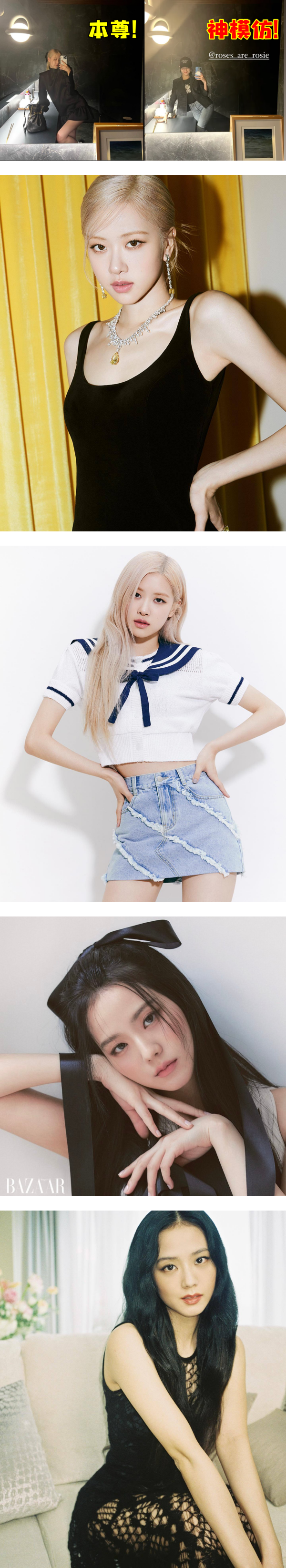 BLACKPINK成员Rosé 近日在社交平台上晒出六宫格照片,金发黑裙对着镜子怼脸自拍,氛围感满满!而队友Jisoo则在社交平台上神模仿Rosé 的动作,还写下:“是不是很像呢?”,让Rosé 调侃:“LMFAO (笑死我了)”。