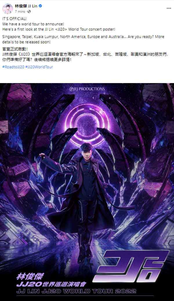 JJ林俊杰在12日于官方脸书,晒出JJ林俊杰《JJ20》世界巡迴演唱会官方海报!