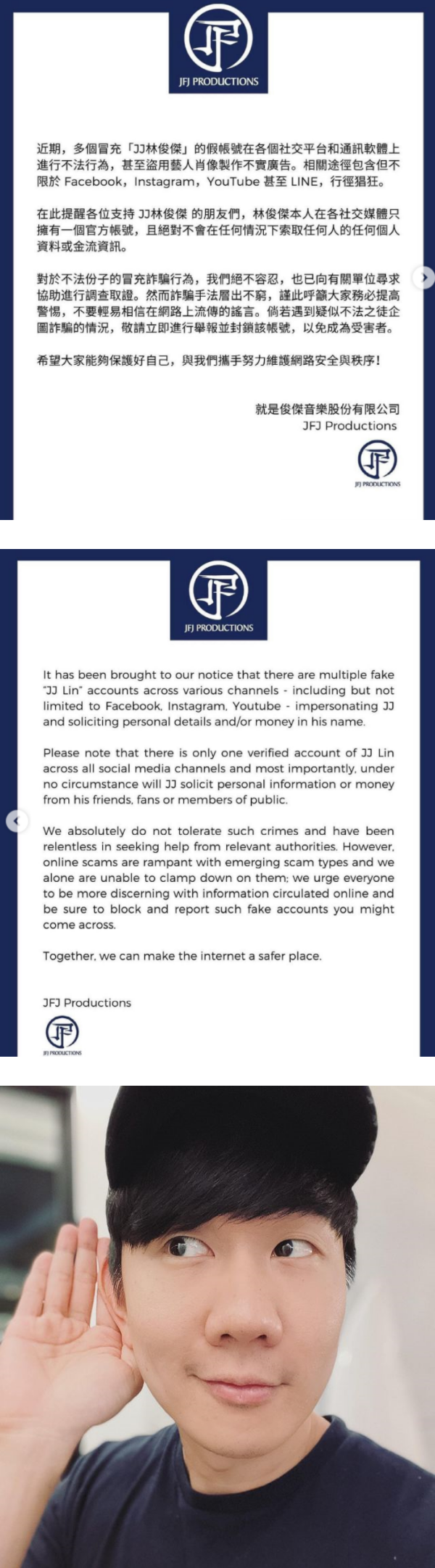 JJ公司特别提醒林俊杰的粉丝,官方认证的社媒账号只有一个,“且绝对不会在任何情况下索取任何人的任何个人资料或金流资讯。”JJ公司一而再呼吁、提醒粉丝别上当。