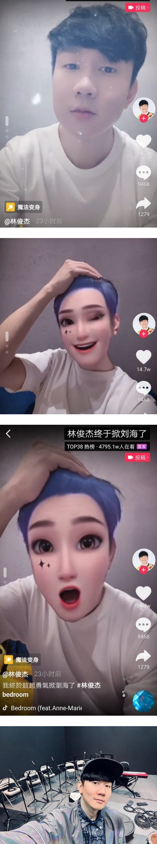 林俊杰在某影音平台上发布了视频,他写下“我终于鼓起勇气掀刘海了”,画面中看到林俊杰顶着招牌刘海造型,下一秒他把额头前的刘海掀起,正当粉丝期待能看到他的额头时,没想到林俊杰开启了滤镜,瞬间化身做漫画男主。