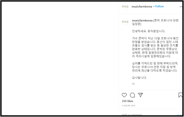 John Park所属经纪公司Music Farm在官方IG宣布:“John Park在15日确诊新冠肺炎”。他是无症状患者,目前已经进入医院隔离,而身边活动路线重叠的工作人员,也都已经采取检测等措施:“我们将尽最大努力管理和隔离。”