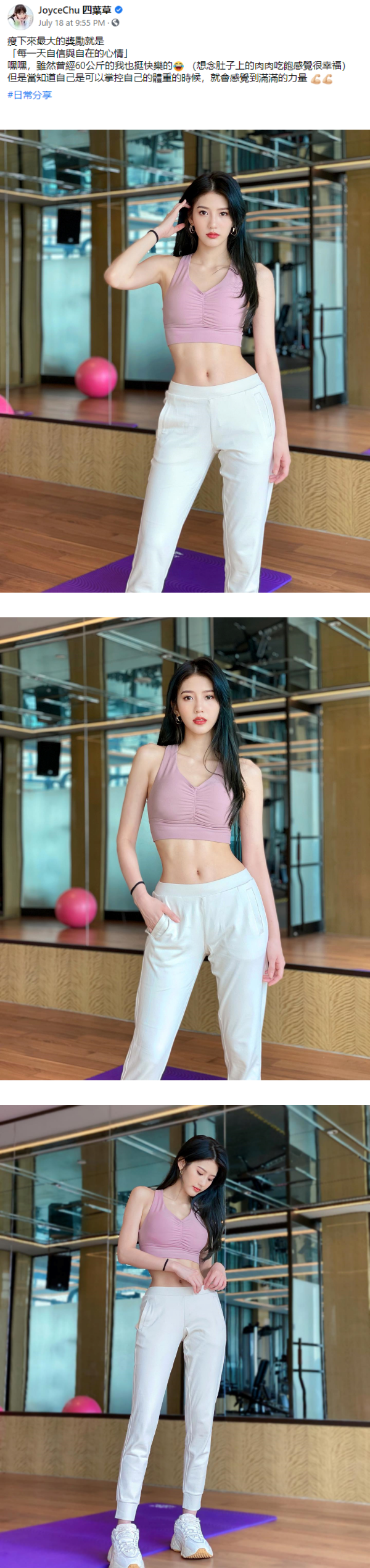 朱主爱穿着紫色运动背心搭配白色裤子入镜,大方秀出腹肌。她分享瘦身成功的心情:“瘦下来最大的奖励就是‘每一天自信与自在的心情’;当知道自己是可以掌控自己的体重的时候,就会感觉满满的力量。”