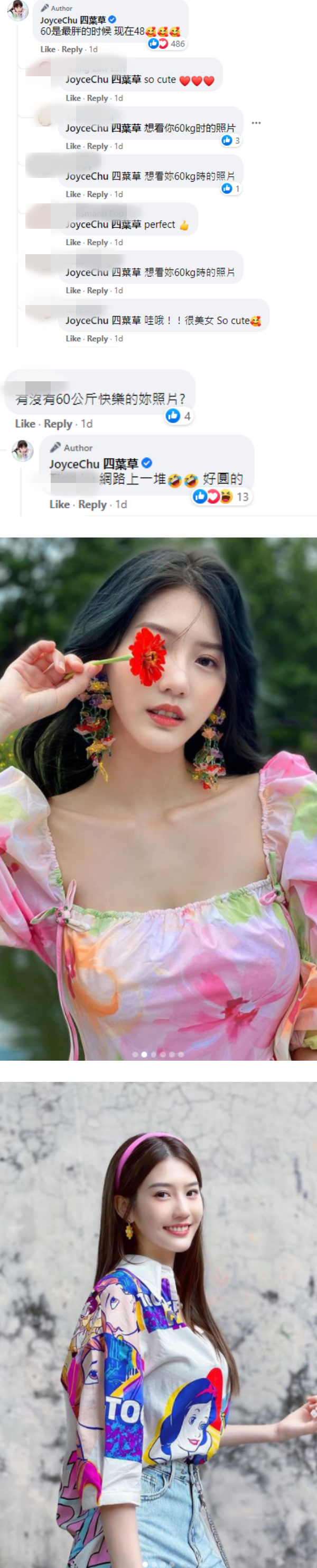 她透露现在的体重为48KG,最胖时期是60KG:“想念肚子上的肉肉,吃饱感觉很幸福。”不少网友喊话,表示想看朱主爱60KG时期的照片,她则调皮回应:“网路上一堆,好圆的。”