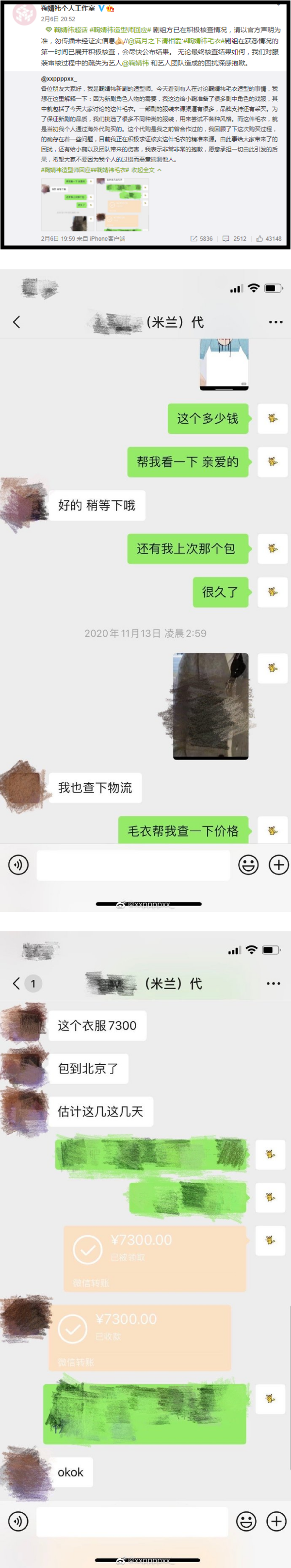 鞠婧祎造型师昨天(6日)发文,指蓝色毛衣是自己透过海外代购买的,并晒出聊天记录佐证,“我回顾了下这次购买过程,的确存在着一些问题,目前我正在积极求证核实这件毛衣的精准来源”,并向鞠婧祎和团队道歉。