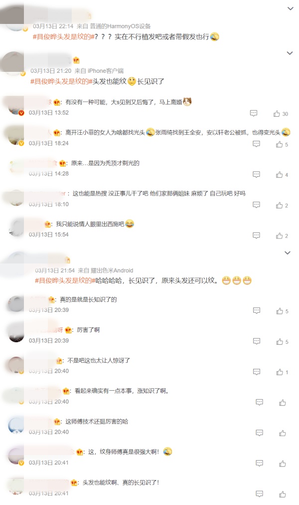 具俊晔纹发际线一事曝光后,网友留言,“有没有一种可能,大s见到又后悔了,马上离婚”、“我只能说情人眼里出西施”、“实在不行植发吧或者带假发也行”、“头发也能纹 长见识了 ”等。