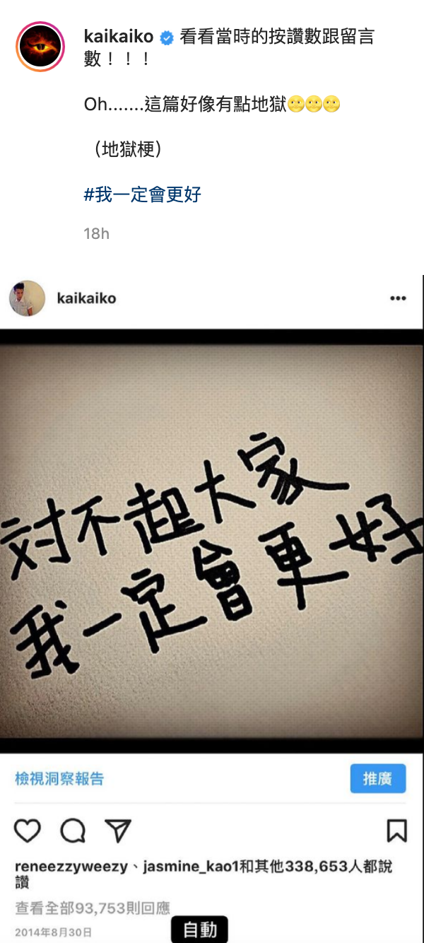 几个小时后他更是放出之前因吸毒而发出的“道歉文”, 请网友们看看当年的按赞数和留言数,再次提起自己的黑历史,幽默的以地狱梗自嘲,并在贴文最后hashtag 我一定会更好,对自己信心喊话。