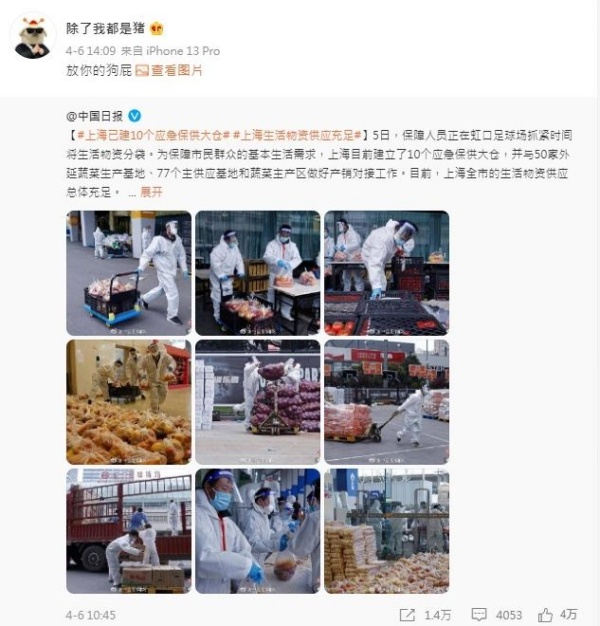 中国官方曾宣称上海虽封城但物资绝对够,可子看见后气得大骂“放你的狗屁”,表示仅有部分社区可以得到基本物资,像她居住的社区得不到物资,就只能靠朋友或自力救济。