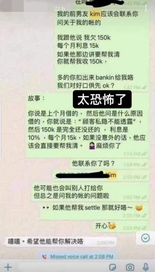 据聊天记录,YBB向债权人透露前男友Kim会联系他,问关于自己欠下的债:“我跟他说我欠150k,每个月利息15k。”为了不穿帮,她连故事都编好了:“你说是上个月借的,然后他问是什么原因借的,你就说是‘顾客隐私不能透露’,然后150k是完全还没还的,利息是10%,每个月15k。”