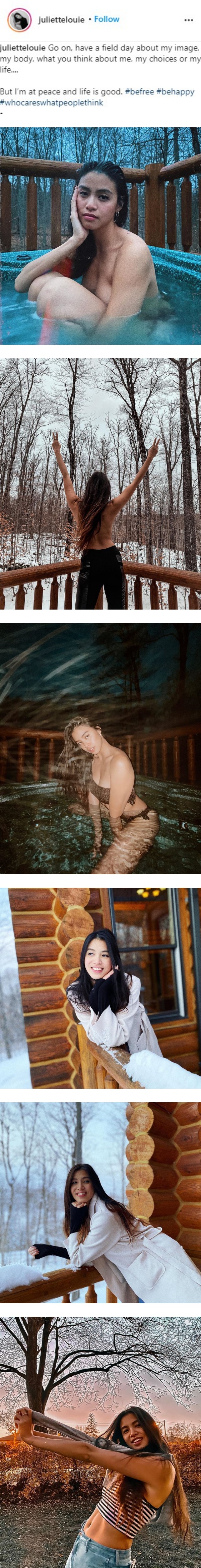 翻看雷庄?的IG,她这几天陆续更新出多张,在冰天雪地下泡澡、赤裸上半身拍下背影的照片,但却惹来网友恶评,有者甚至嘲笑她像菲佣。