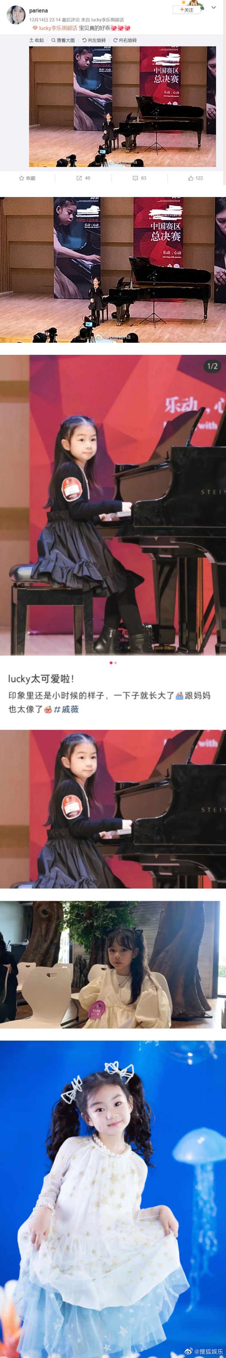 近日有网友发文,透露在钢琴比赛的会场上偶遇Lucky。照片中,只见Lucky穿着一件深色公主裙,脚踩皮靴,搭配黑色打底裤,五官非常精致,乖巧可爱。而且即使是站在台上面对不少目光和镜头,表现也丝毫不怯场。