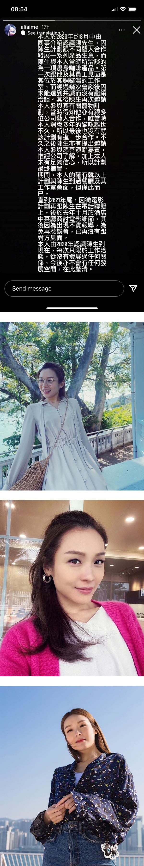 李佳芯在IG Story中列出,每次和Mark见面的内容,同时指两人会面都是因为商讨工作。去年10月,李佳芯和Mark在酒店餐厅商讨微电影事宜,但事后传出两人在酒店密会,未免再出现误会,李佳芯称已经在那之后没有和Mark见面,“本人由2020年认识陈生到现在,每次只限于工作洽谈,从没有发展过任何关系,今后亦不会有任何发展空间,在此厘清。”