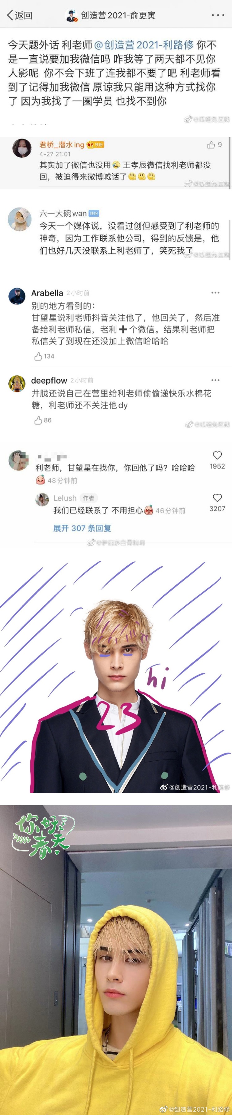 其中俞更寅在微博向利路修喊话:“你不是一直说要加我微信吗?咋我等了两天都不见你人影呢?你不会下班了连我都不要了吧?利老师看到了记得加我微信,原谅我只能用这种方式找你了,因为我找了一圈学员也找不到你。”