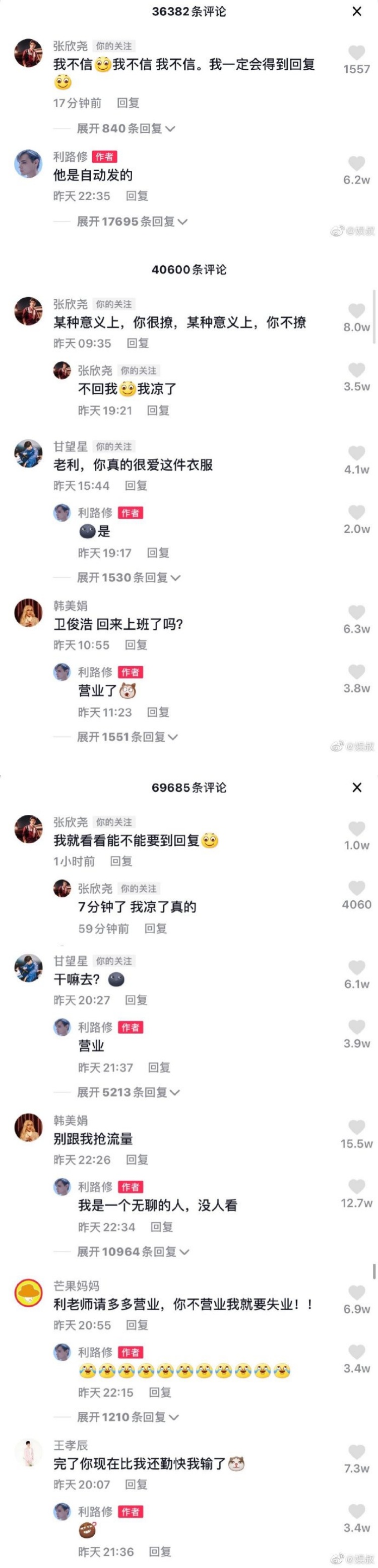 张欣尧日前在利路修的抖音、小红书等平台积极留言,但利路修却只回复了甘望星、韩佩泉等人,偏偏就是不回应张欣尧。