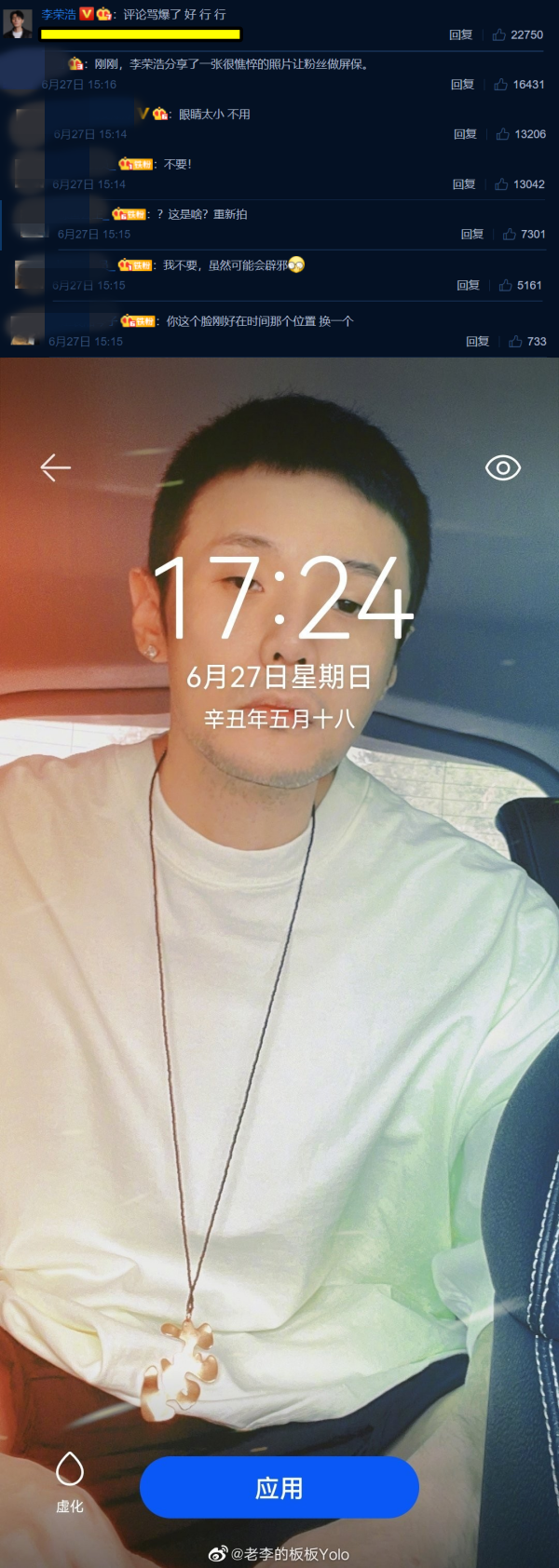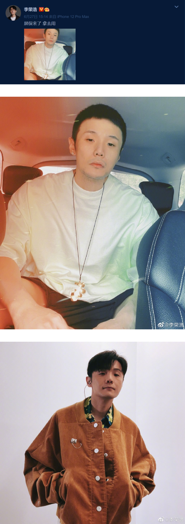 歌手李荣浩不时在微博上分享自己的生活点滴,近日他大方分享自拍照供粉丝用作屏保用途,但没想到粉丝不领情,开启留言调侃模式。