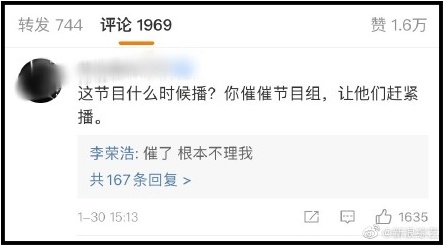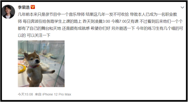 他还在文中透露,今年有几个练习生唱歌很好听一番剧透让网友心痒痒:“这节目什么时候播?你催催节目组,让他们赶紧播”,此留言获李荣浩本人回复:“催了,根本不理我。”