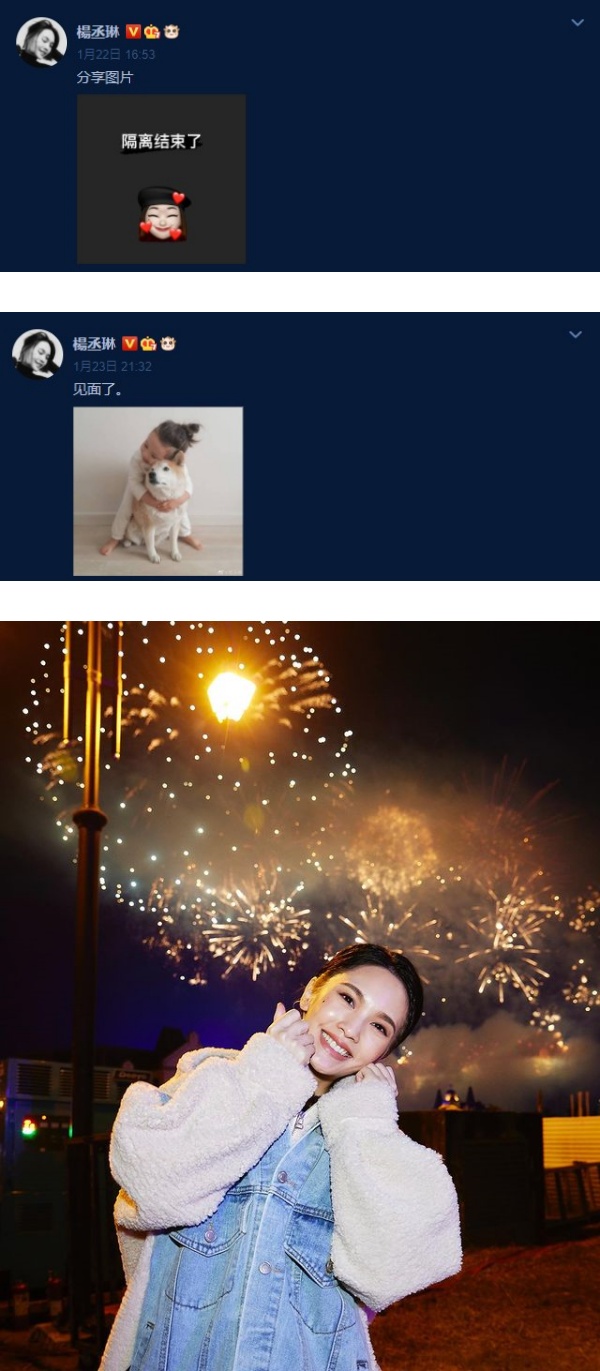 杨丞琳在上个周末发文指,自己隔离结束,随后再贴出一张女生抱着狗狗的照片写下,“见面了。”网友都留言希望杨丞琳能晒出两人的合照。