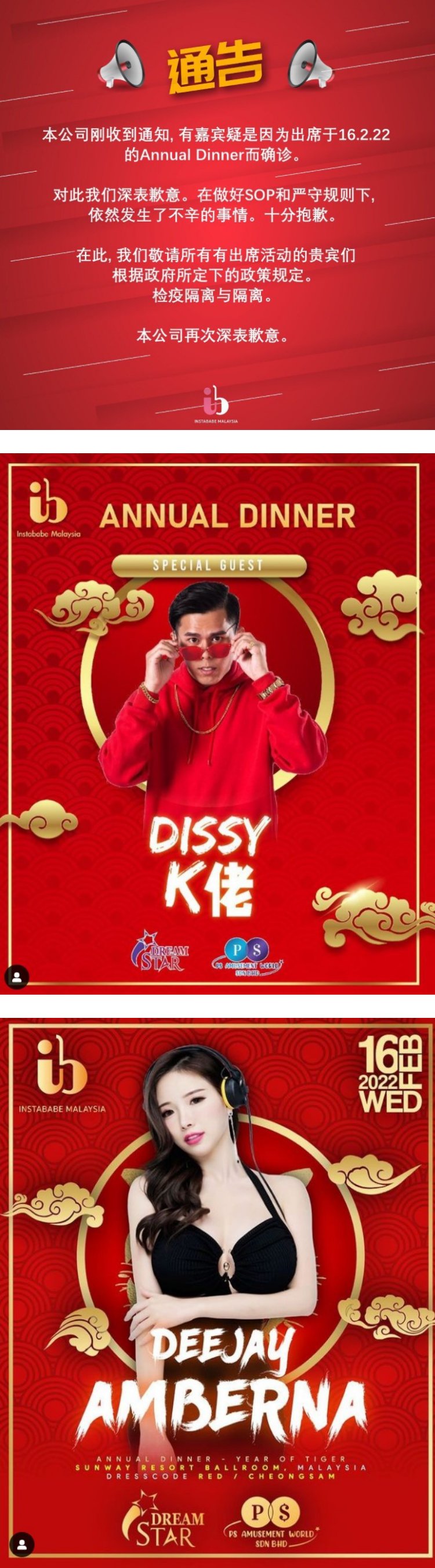 该网红平台16日举办新年晚宴,邀请低清K佬、DJ Amber Na担任表演嘉宾,晚会非常盛大。没想到官方今天(19日)凌晨在IG发公告,“本公司刚收到通知,有嘉宾疑是因为出席于16.2.22的Annual Dinner而确诊。对此我们深表歉意”,并提醒所有出席活动的嘉宾根据政府所定下的政策规定,进行检疫隔离。
