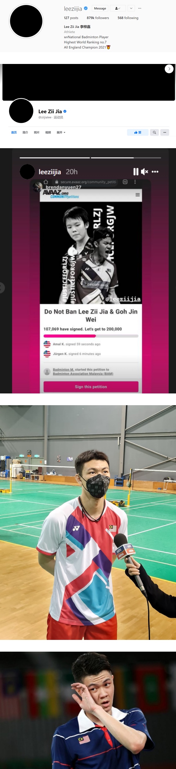 李梓嘉被禁赛后,他把社交媒体的头像换成黑色,同时也陆续在Instagram Story上转发感谢好友们签署反对李梓嘉、吴堇溦被禁赛请愿书。据悉,该请愿书已经累计超过10万签署、支持。