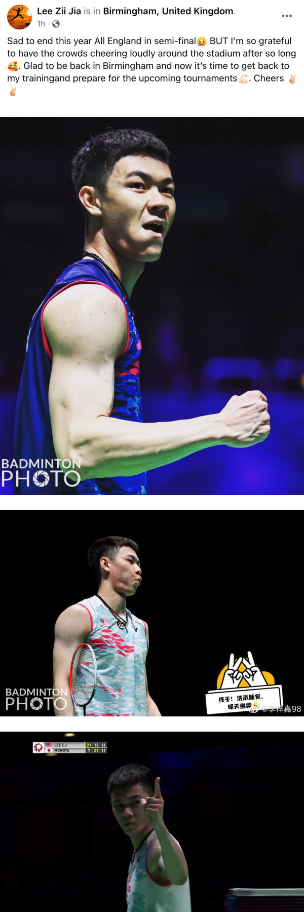 李梓嘉在20日也透过社交平台发声,表示虽然自己很难过的在半决赛结束了全英赛的旅程,但必须感谢在球馆上坐满球迷的欢呼声和尖叫声。他除了已经尽了最大的努力打这场比赛,也会在回国后积极备战接下来的赛事。