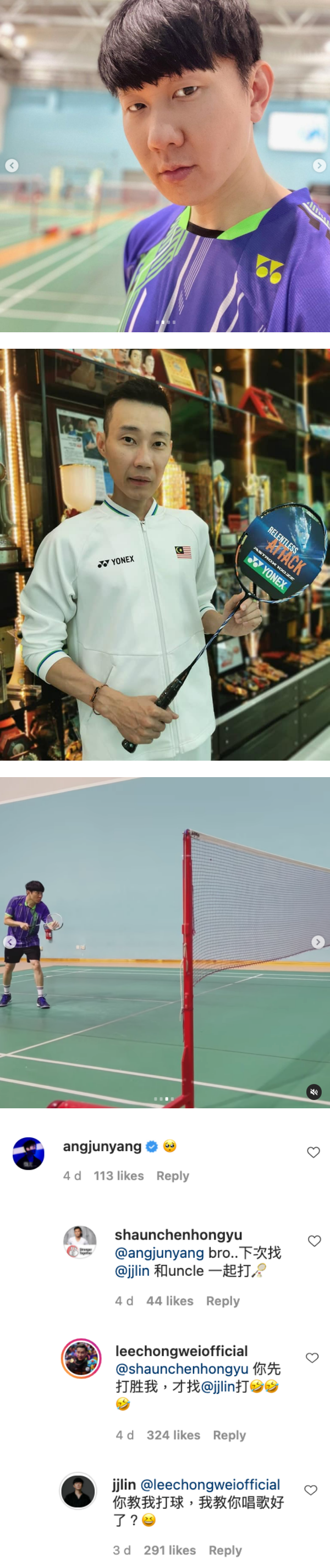 金曲歌王林俊杰(JJ) 日前结束《圣所》线上演唱会后已返回家乡新加坡,近期常在社交平台上分享日常生活。他在IG 上晒出了一张于爸爸打羽球的照片后,成功钓出曾是羽毛球选手的演员陈鸿宇及洪俊扬留言表示要一起打羽球,让大马羽球传奇拿督李宗伟回复:“你先打胜我,才找JJ打。”