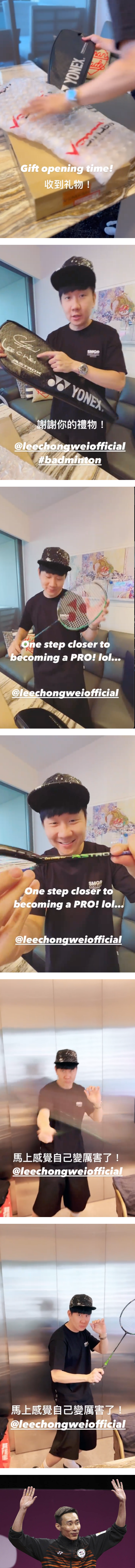 林俊杰于13日于Instagram Story 上晒出了李宗伟亲笔签名的羽毛球袋,还拿出印有李宗伟名字的羽球拍搞笑狂挥,笑着说:“我感觉自己变厉害了”,笑翻全网!