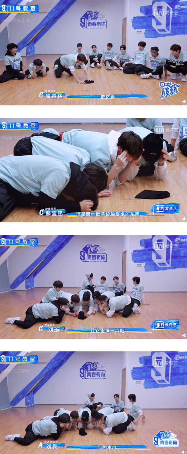 在最新一期节目中,梁森代表组员去抢歌,而在休息室的刘隽、麟壹铭、段星星等人脑洞大开,将梁森留下的帽子放在正中间,众人趴伏在地围着帽子,用手指按着脑袋,集气:“心想事成、心无杂念”,画面非常搞笑。
