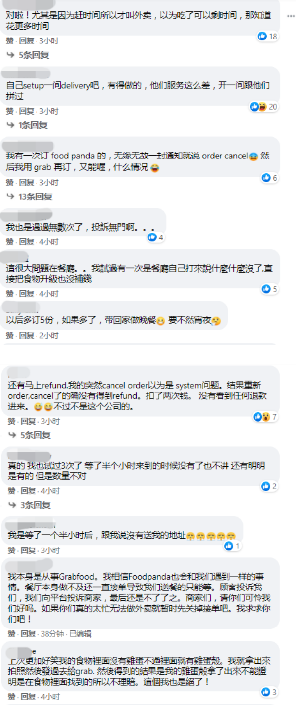 林德荣发文后,不少曾遭遇类似情况的网友也纷纷留言,吐槽:“对啦!尤其是因为赶时间所以才叫外卖,以为吃了可以剩时间,那知道花更多时间”、“我也是遭遇过很多次了,投诉无门啊”、“真的,我也试过3次了,等了半个小时来到的时候没有了也不讲。”