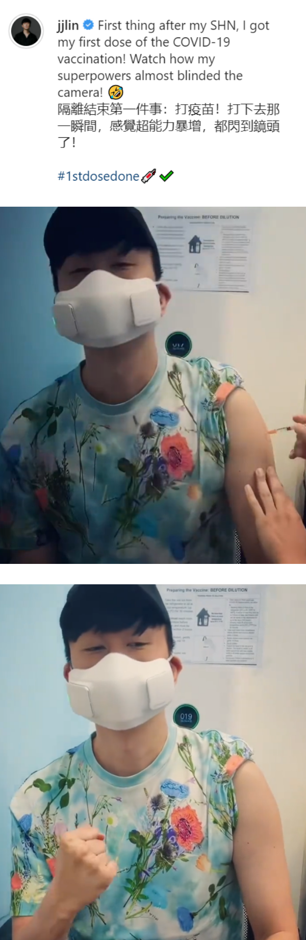 30日午间,林俊杰在Instagram上发了一段接种疫苗的视频,他提到隔离结束后的第一件事就是打疫苗,“打下去那一瞬间,感觉超能量暴增,都闪到镜头了!”文末他特地标签写上“#1stdosedone”。