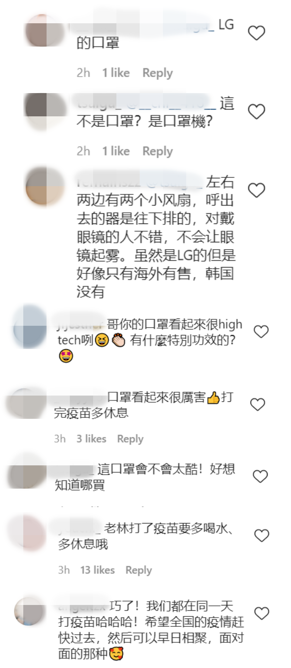 其中,林俊杰脸上戴着的白色超级口罩吸引了网友的注意,“这口罩会不会太酷!好想知道哪里买”、“哥你的口罩看起來很high tech咧”、“口罩看起来很厉害”等,粉丝也不忘叮咛林俊杰,接种疫苗后要多喝水、好好休息。