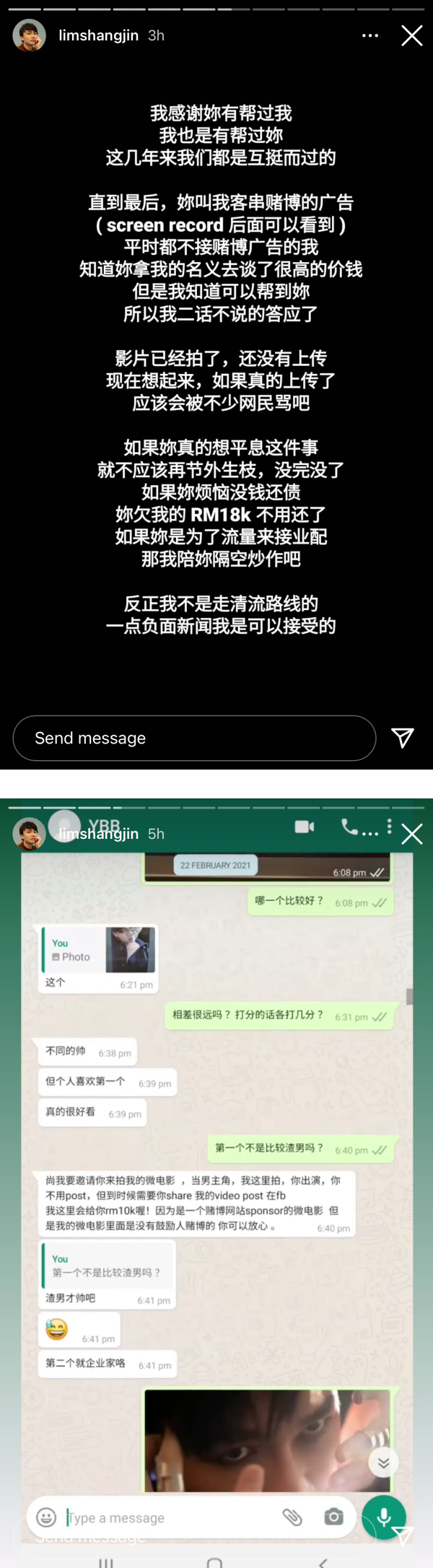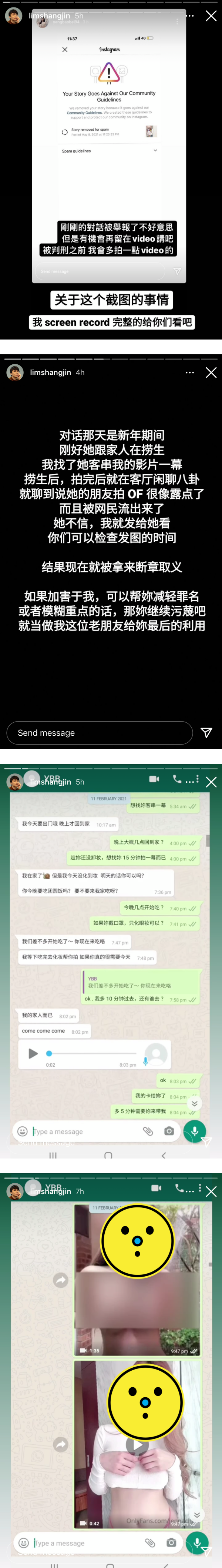 林尚进在Instagram 限时动态上帖文并附上2月11号的对话截图,他指出:“对话那天是在新年期间,刚好她跟家人正在捞生,我找了YBB客串我视频中的一幕,后来就在客厅闲聊八卦“。聊天时他提到了YBB的网红朋友拍摄的性感视频似乎有露X ,更被网民们外流,所以才发了一系列网红露骨照和视频给YBB 证实,而并不是像YBB 说发露骨照来骚扰她,结果现在被YBB拿出来断章取义。