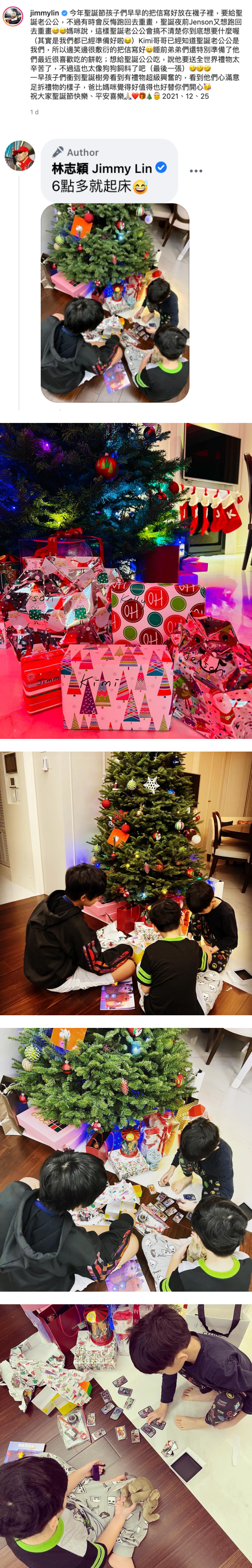 圣诞节当天,家中有三个小孩的林志颖在社交平台上分享了准备圣诞礼物的过程。家中超高的圣诞树除了挂满了红色、绿色的装饰之外,树下也已经堆满他准备给孩子们的礼物。