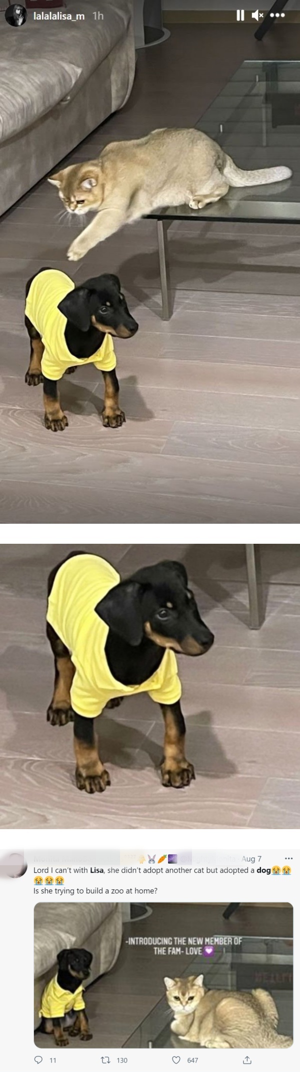 据悉,LISA曾表示LEGO是自己养的最后一只猫,没想到现在又养了狗。网友笑道:“没错啊,LEGO是最后一只猫...接下来是养狗!”