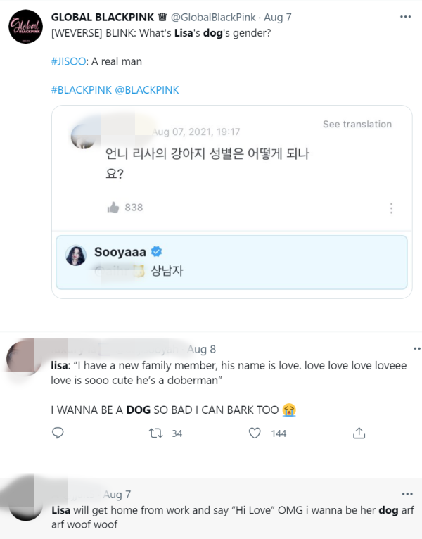 队友Jisoo曾透露,LOVE是只公犬。网友除了调侃LISA可能想把家里变成动物园,也表示非常羡慕小狗:“想象LISA说:早安LOVE、LOVE过来”、“我也想成为小狗”。