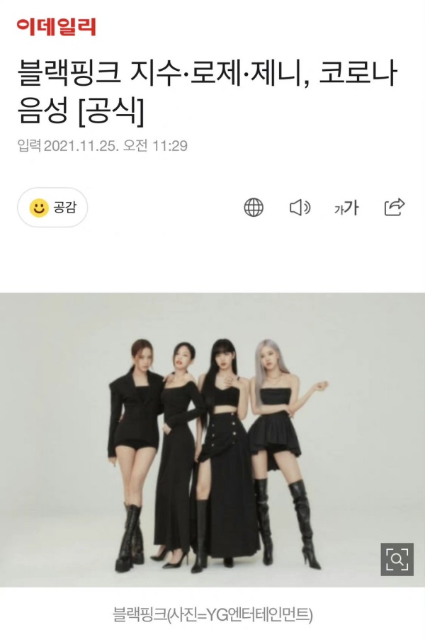 YG娱乐发声明宣布,BLACKPINK其他3位成员的检测结果皆呈阴性、LISA状态也良好:“BLACKPINK的4名成员全部接种了新冠疫苗,本公司及所属艺人格外重视安全和健康。”