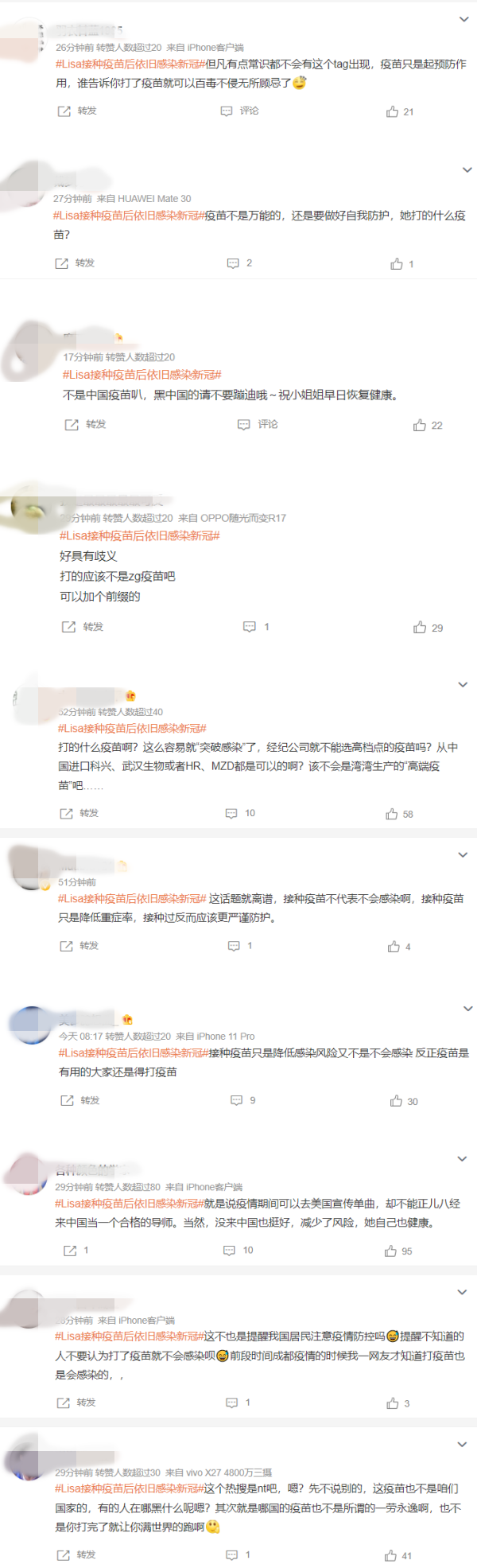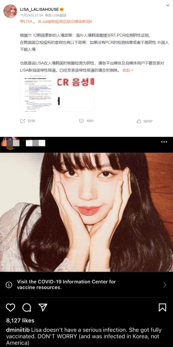 除此之外,微博网友也热衷于讨论LISA究竟接种什么疫苗:“打的应该不是中国疫苗吧”、“经纪公司就不能选高档点的疫苗吗”、“哪国的疫苗也不是所谓的一劳永逸啊”,有人借此强调“接种疫苗只是降低感染风险又不是不会感染”、“接种疫苗只是降低重症率”。