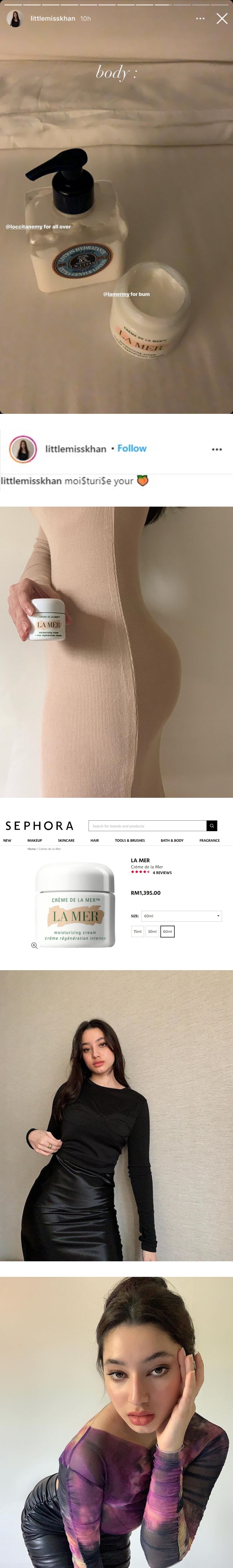 Little Khan在IG上拥有1.3M的追踪者,她也经常分享自己的美照、护肤心得等。近日,她在IG限时动态上分享自己所使用的护肤产品,图中看到她选用L'Occitane为自己全身护肤,La Mer则是用来擦屁屁。