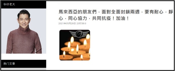 刘德华于28日在“华仔天地”附上蜡烛的照片,发文:“马来西亚的朋友们,面对全面封锁两周,要有耐心,静心,同心协力,共同抗疫!加油!”